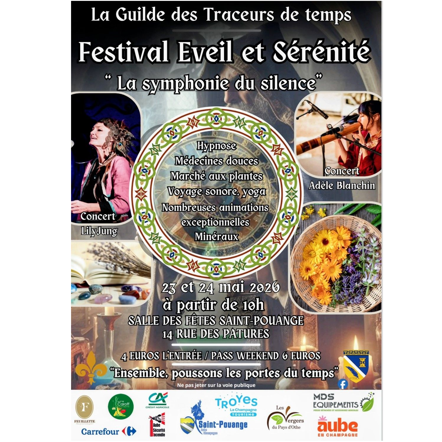 La Guilde des Traceurs de Temps vous propose un voyage dans le bien-être sous toute ses formes, le temps d'un week-end venez apprécier et vous détendre lors d'ateliers d'initiation que ce soit à la méditation, au tambour chamanique, au yoga ou autre voyage sonore ou même séance d'hypnose sans oublier nos concerts. Tout est fait pour que vous puissiez passer un week-end complet avec les Traceurs de Temps.